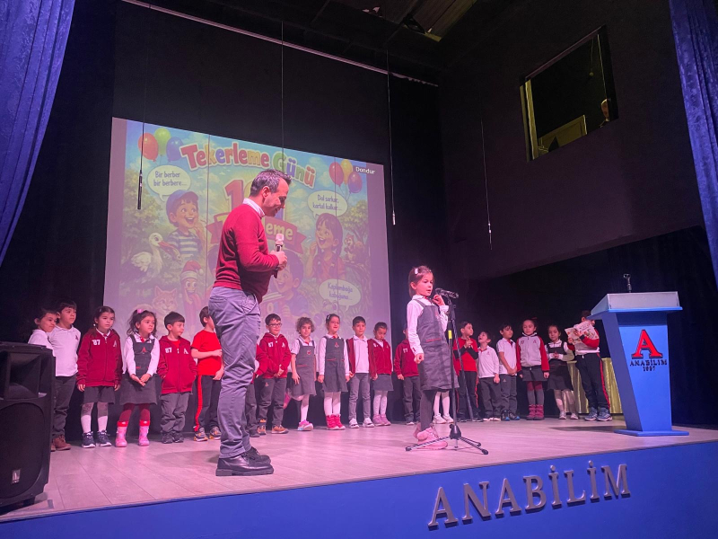 1. sınıf öğrencilerimiz de “101 Tekerleme” kitabını okuyarak Türkçenin zengin ve eğlenceli yönünü keşfetti. Etkinlik sürecinde öğrenciler, kitapta yer alan tekerlemeleri inceleyerek okuma, doğru telaffuz ve akıcı konuşma becerilerini geliştirdi. Yapılan çalışmalar sonucunda seçilen örnek tekerleme, öğrencilerimiz tarafından sahnede okunarak sunuldu. Gerçekleştirilen sahne etkinliği ile öğrencilerimiz hem öz güvenlerini geliştirme fırsatı buldu hem de dilimizin sözlü kültür ürünlerini yakından tanıdı.