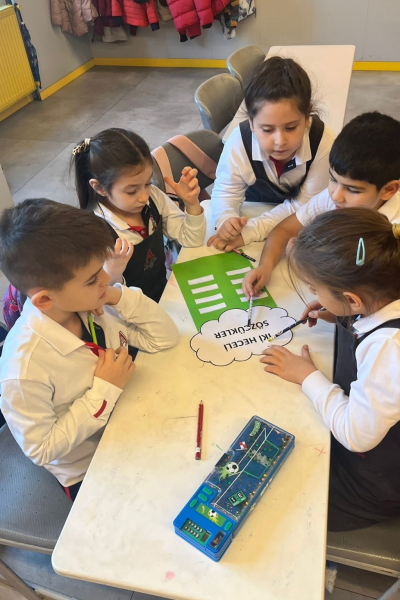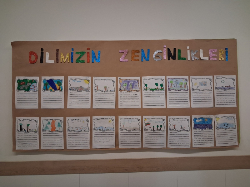 “Dilimizin Zenginlikleri Projesi” kapsamında ekim ayında, 5. sınıflarla yürütülen çalışmalarda öğrenciler, deyimler ve atasözleri üzerine sözlük tasarımı yaparak dilin anlatım gücünü yakından tanıma fırsatı buldu. “Dilimizin Zenginlikleri” panosunda deyim ve atasözlerinin günlük hayattaki kullanımları somut örneklerle yer aldı.