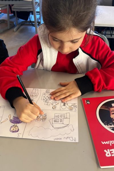 Aralık ayında, 4. sınıf öğrencilerimizle ise “Okumanın Gücü” temalı cümle ve afiş oluşturma etkinliği gerçekleştirildi. Etkinlikte öğrenciler; kitap okumanın bilgiye ulaşma, kelime dağarcığını geliştirme ve hayal gücünü güçlendirme yönlerini, Türkçenin anlatım imkânlarını kullanarak özgün cümlelerin yer aldığı afişlerle buluşturdu. Öğrencilerin hazırladığı çalışmalar fotoğraflanarak arşivlendi.