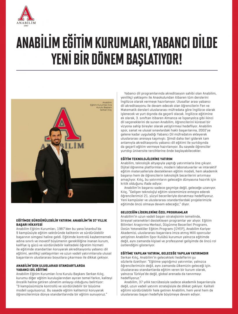 Serkan Kılıç, Anabilim’in gelecekteki hedeflerini şu sözlerle özetliyor: “Eğitime yaptığımız yatırımlar, yalnızca öğrencilerimizin değil, aynı zamanda ülkemizin geleceği için. Uluslararası standartlarda eğitim veren bir kurum olarak, yalnızca Türkiye’de değil, global arenada da tanınmayı hedefliyoruz.”